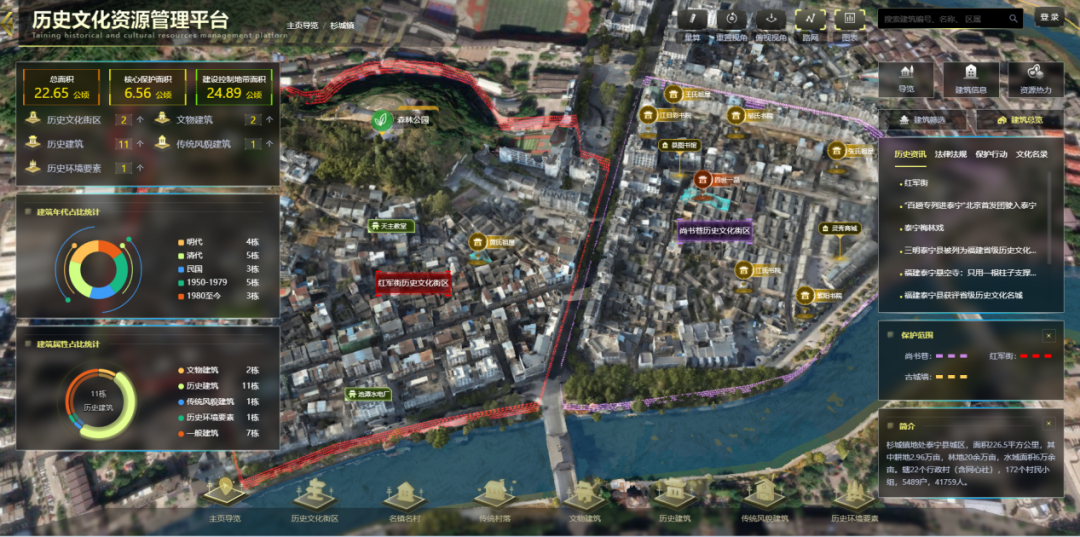 系统平台以GIS地理信息为基础底图,通过倾斜摄影建模技术+BM技术实现数宇孪生效果,真实还原千年古城风貌。在此基础上融入数字化技术,通过数字图表等方式,迅速直观地体现数字乡村的全局信息,同时也带来三维化、可视化、动态化、交互化的展示体验。