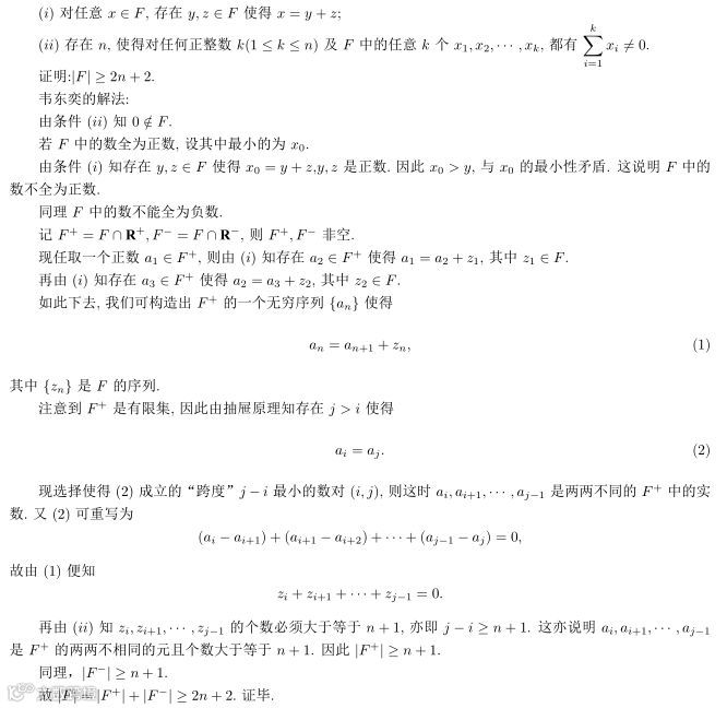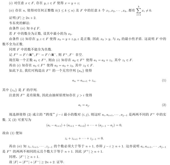 上海大学的冷岗松教授从美国数学月刊找了一道题,大多数选手所提供的都是图论证法,而韦东奕仅用了一下极端分析,就将这道题目给解出,解法自然而优雅,直到今日,冷岗松教授还经常会向竞赛刚入门的学生讲解这一方法,并戏称这是"韦方法".