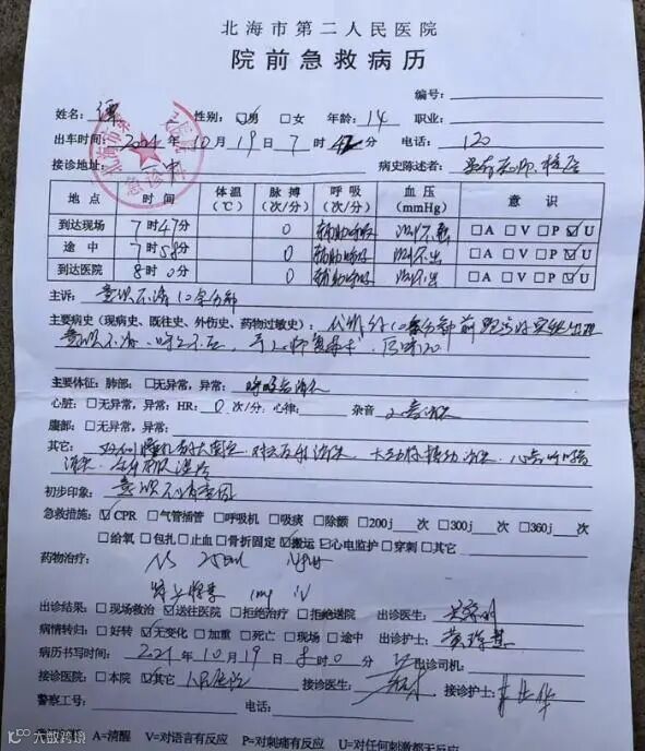 北海市人民医院出具的一份尸检报告显示,小谭因为治疗无效,在10月19号上午10点钟临床死亡,死亡原因初步考虑为心源性猝死,小谭是家里的独生子,成绩优异,热爱运动,他还在游泳馆救过一个小孩,却没能救自己。