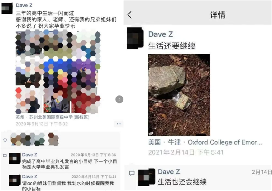 一条是在高中毕业典礼发言后,请大家监督他不要划水;一条是感慨“生活还要继续,生活也还会继续”,配了一张在石头上摔碎酒瓶的图。