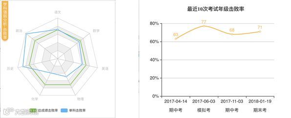 (1)学科强弱分析:从击败率和得分率两个角度,直观了解孩子的优势学科与劣势学科。