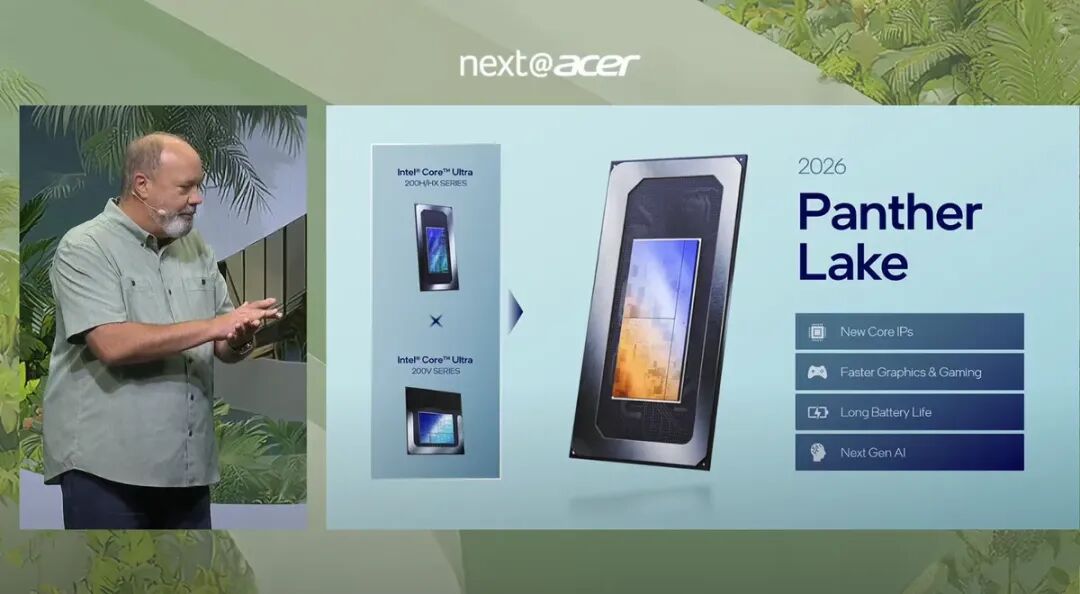 近两天在 IFA 2025 亮相的 Acer Swift 16 AI,首次搭载 Panther Lake,被媒体称为英特尔“下一代”的窗口:采用 18A 工艺、Cougar Cove(P 核)+ Darkmont(E 核),英特尔会场口径给出“速度+25%、能效+38%”,NPU 峰值算力目标约 180 TOPS(较 Lunar Lake 的 120 TOPS 再上台阶)。但现场并无独立评测,量产时间也被指向 2026 年初,因此目前仍属“积极信号”,非落地实测。