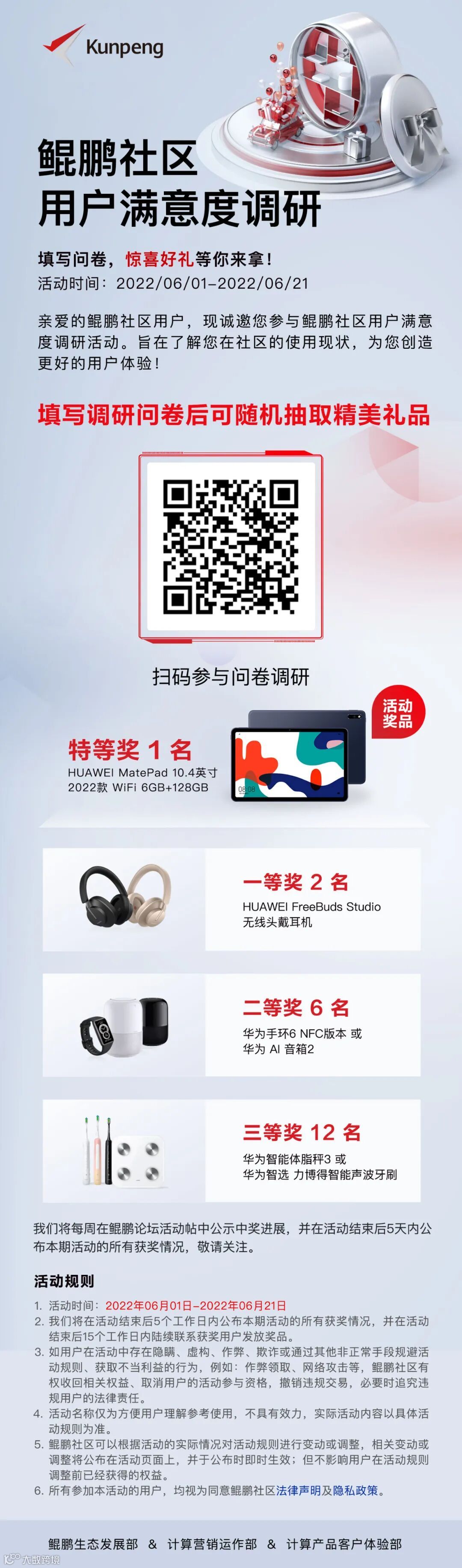 为了提升鲲鹏社区的体验,现诚邀您参与鲲鹏社区用户满意度调研活动,旨在了解您在社区的使用现状,为您创造更好的用户体验!完成调研后可参与抽奖,HUAWEI MatePad等你来拿!还有FreeBuds Studio无线头戴耳机、AI音箱、电动牙刷等丰富奖品!