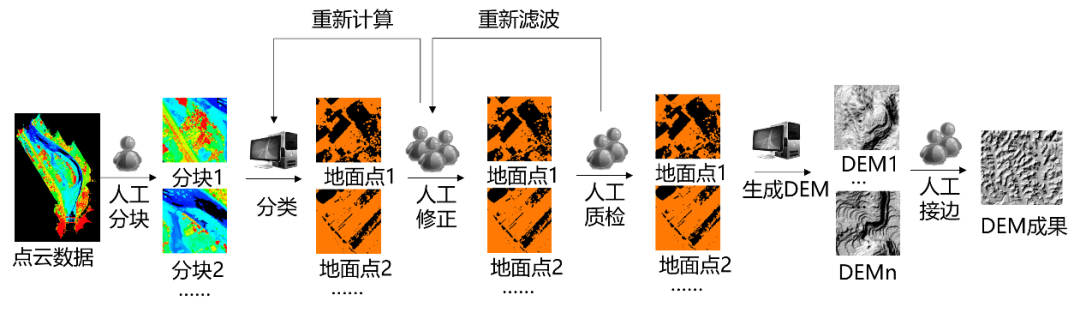 北方某省测绘单位接到了大机载激光雷达点云数据,4500km2的1:2000 DEM的生产项目。如果采用传统生产流程,1人1天平均生产DEM4-5km2。