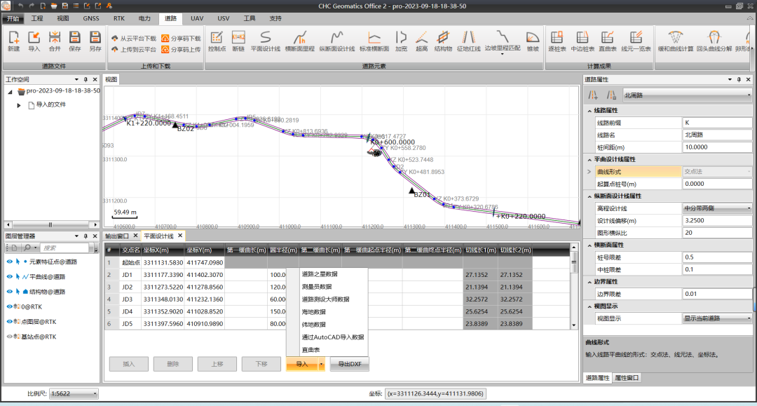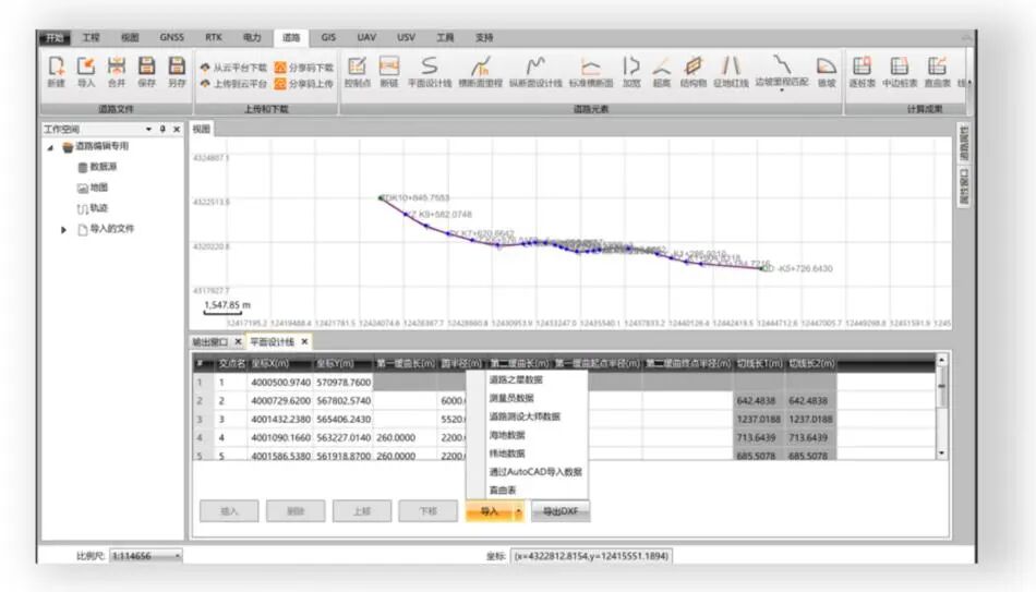 可导入纬地直曲表、道路测设大师、测量员等设计数据,输入完成后进行数据检核。