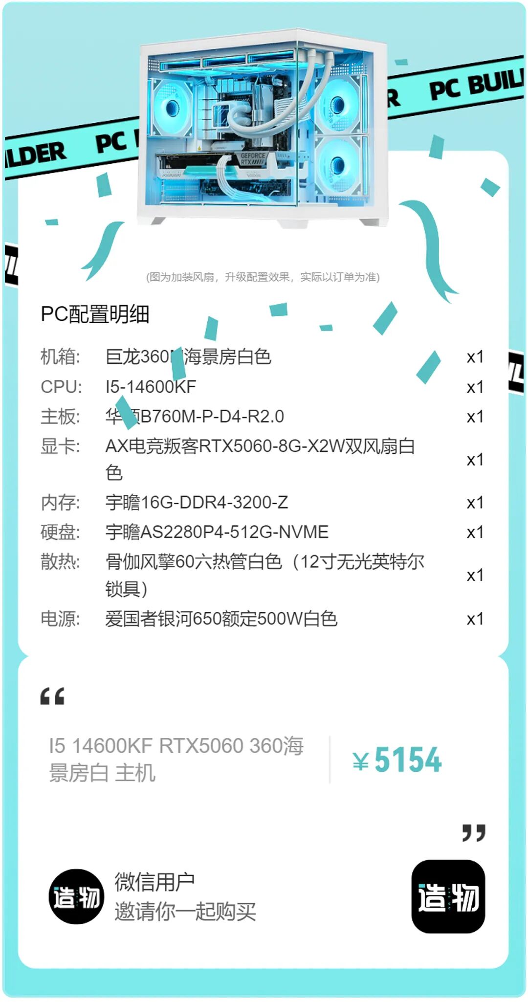 价格控制在 5154 元,适合预算在 5K 左右的主流玩家,办公+游戏一体。