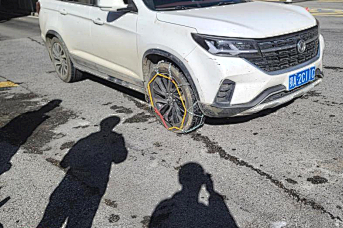 考虑到是连续上坡路段而且接下来的盘山路面存在未知结冰情况,我们商议之后决定先往回走。陕总缓缓倒车,在一个结冰较少的路面掉头,开回了景区管理处。在跟景区工作人员沟通之后,我们给车子装上了防滑链。