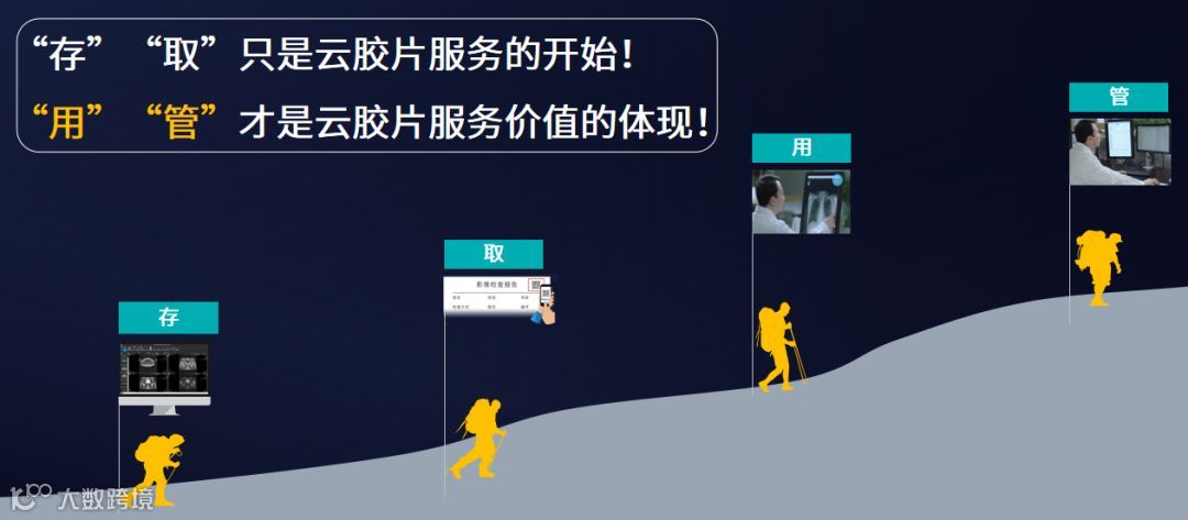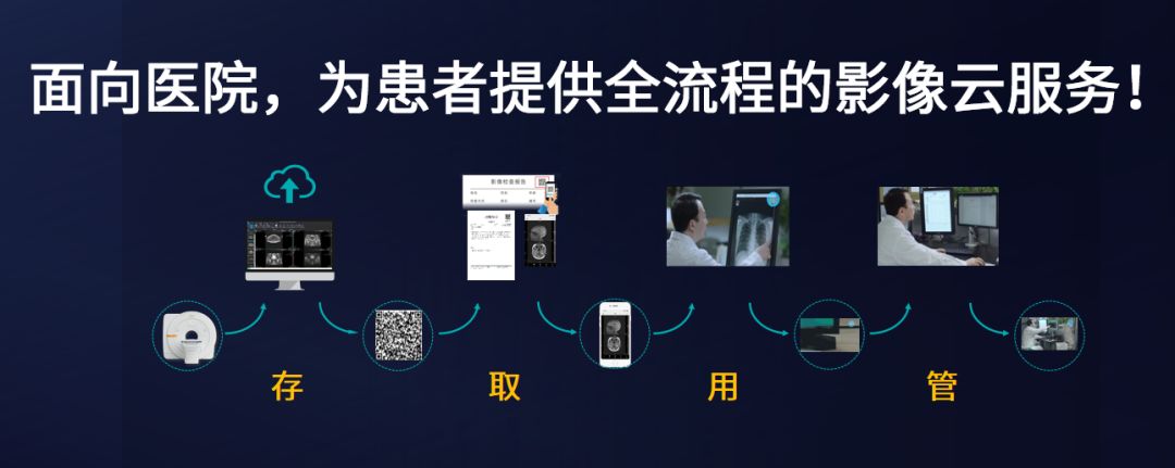 要实现云胶片的应用,首先要做的就是要数据上云,把数据存储在云端,这是存的场景,在存完之后的同时要给患者提供带有二维的报告单或者提供移动端的查询服务,这是第二个取的场景。那这两步其实就是实现云胶片服务的开始,但是,云胶片要流通起来、用起来,那就需要有第三步 “用”,这就是我们为医院提供云胶片的三种智能套件,来解决患者使用云胶片看病和医生阅片的问题,这也是云胶片服务能否真正落地的关键因素。同时我们不仅让云胶片用起来,还帮助医生把这些数据管理起来,让诊断有迹可循,为医生提供工作的好帮手。所以一个完整的云胶片服务流程是必须具备这四个应用场景。