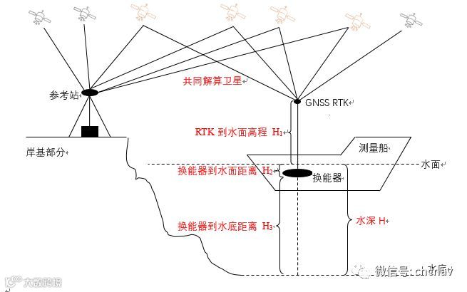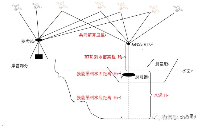 和传统地形测绘不同的是,水下地形测绘多一个水深的获取步骤,水下地形测量包括测点的平面位置和水深测量。平面位置主要采用GNSS 定位技术确定(可达到厘米级的实时定位),水深主要通过各种类型的单波束回声测深仪得到(一般高精度测深仪也可以达到厘米级的测量精度),由水面高程(水位)减去水深可得测点的水底高程。通过无数个测点的平面位置和水深位置的获取,水下地形即可被测量展现出来。下图为水下地形测绘示意图: