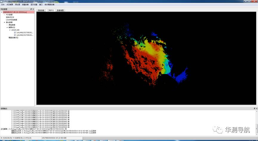 其中:POS解算可按时间输出载体的位置、姿态信息;激光处理则对原始激光文件进行解码,并对激光点坐标进行转换,从而得到WGS-84坐标系下的LAS格式点云;坐标转换是根据用户需求,将点云成果转换到工程独立坐标系下。