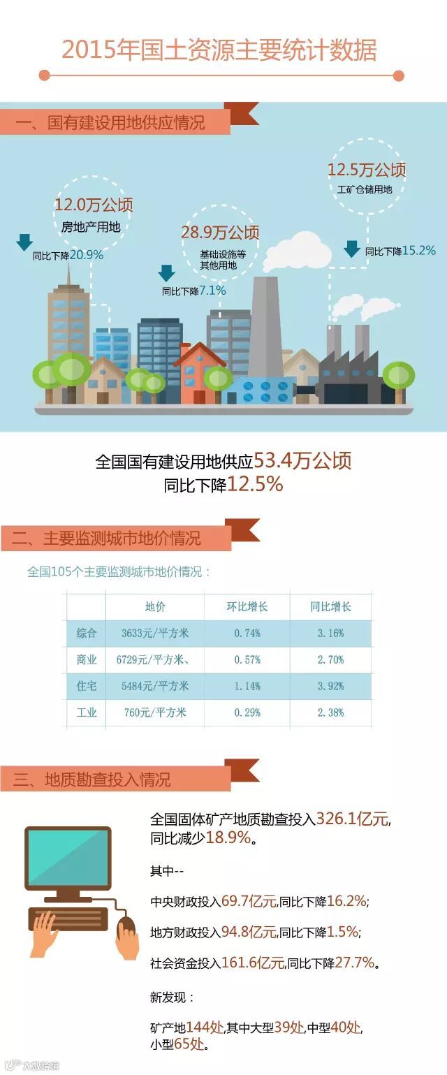 国土资源部日前发布的2015年国土资源主要统计数据显示:去年全国国有建设用地供应53.4万公顷,同比下降12.5%,主要城市地价平稳;全国新发现矿产地144处,其中大型39处;地质灾害造成死亡失踪人数和直接经济损失大幅下降,地灾防治好于往年。