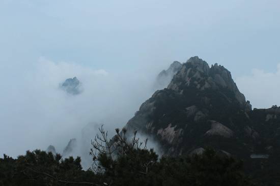 第二天早上7点,坐上大巴,我们奔赴黄山风景区。在景区入口,排队乘坐索道时,黄山的真面目还未露出。随着缆车缓慢上升,惊呼之声随之传来,窗外的景色太迷人了:各具姿态的山石,矗立的云海之中,微风吹来,云雾飘散,幻想是否真有如李太白诗中所言:“仙之人兮列如麻,云至君兮纷纷而来下”。