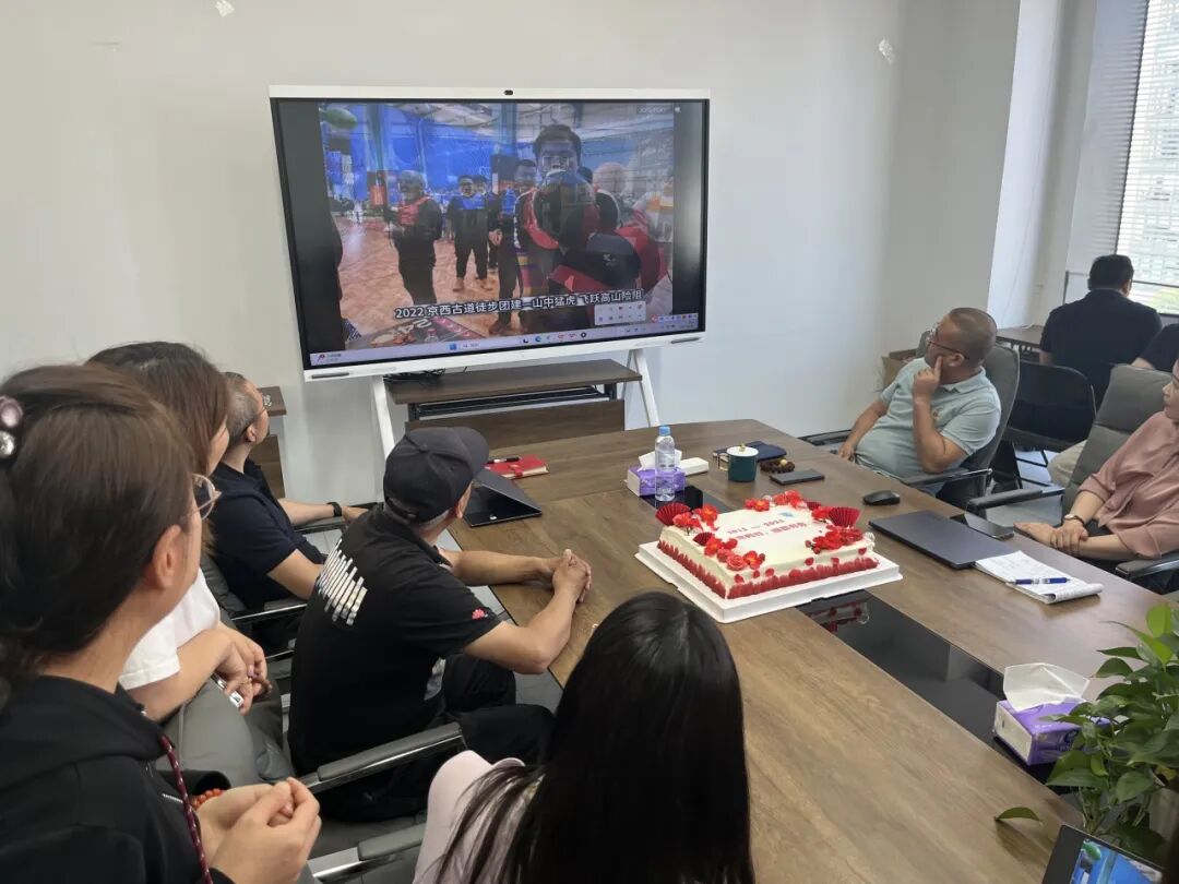 随着十年间的历程视频缓缓播放,一个承载着满满祝福的定制蛋糕缓缓登场。蛋糕主体洁白如雪,上面点缀着娇艳欲滴的红花,红与白的鲜明对比,既增添了视觉上的美感,又展现着王哥在平淡工作中绽放出的耀眼光芒。奶油上精心绘制了公司的 logo 和 “十年同行,感恩有你” 的字样,王哥入职以来又一的重要时间节点就此定格,祝福视频的每一处都饱含着同事们的诚诚心意。
