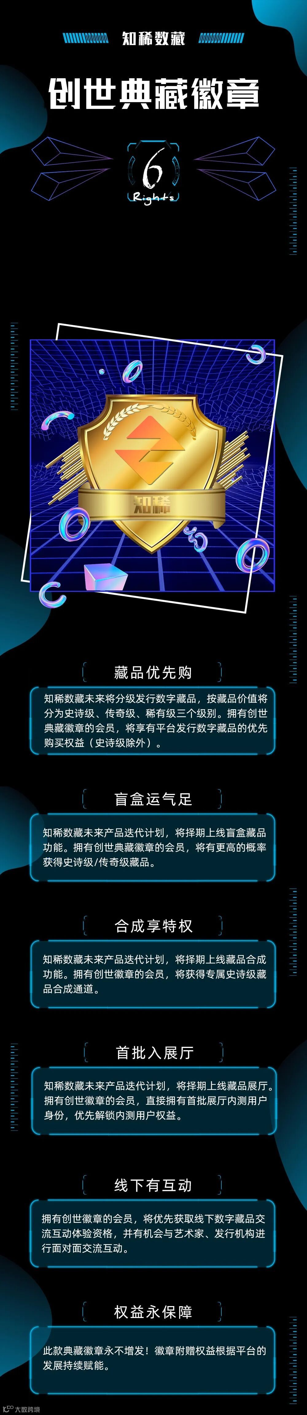 知稀数藏创世典藏徽章附赠永久六大专享权益为典藏徽章数字藏品附赠权益,具体权益的赠送与享受以平台实际产品升级计划为准。