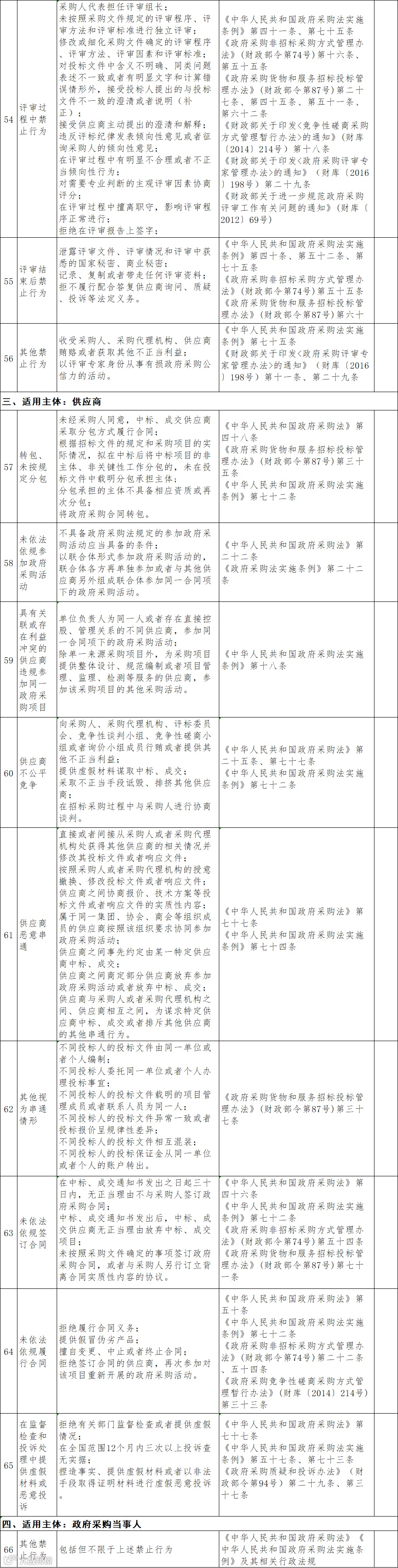 《征求意见稿》共包括66项禁止行为。其中,采购人、采购代理机构的禁止行为分为九类51项行为;评审专家的禁止行为共5项;供应商的禁止行为共9项。