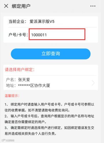 选择对应的缴费机构后,进入用户绑定页面。输入需要绑定用户的户号、卡号、手机号,点击查询。根据查询结果确认是否需要绑定该用户,如果是点击该用户直接进行绑定。如下图所示:
