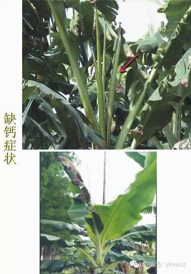 (1)缺氮:香蕉缺氮,叶片淡绿色或黄绿色,小且薄,叶鞘、叶柄、中肋带红色,叶片抽生慢,叶距短。