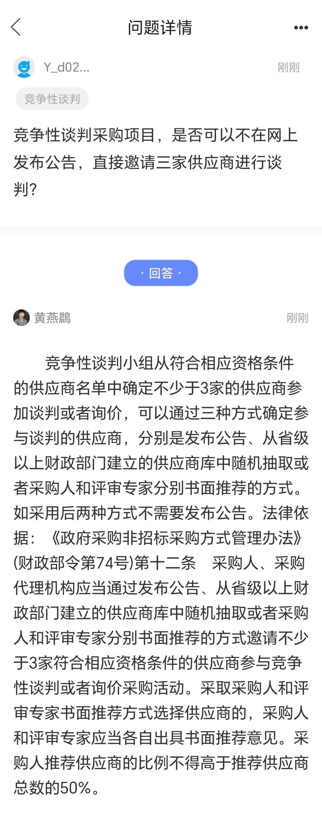 问:竞争性谈判采购项目,是否可以不在网上发布公告,直接邀请三家供应商进行谈判?