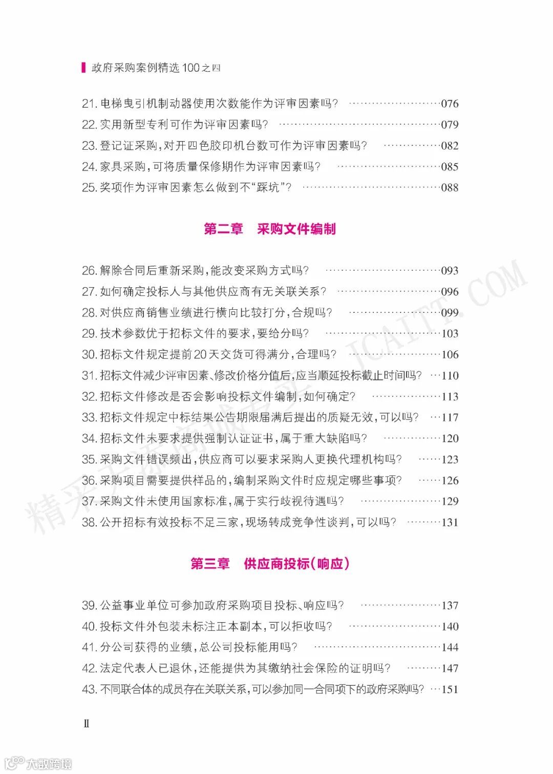 一个个具象的案例或许只能代表政府采购某个环节的问题,一次次对案例的抽丝剥茧或许也只能解决一两个问题,但“铢积寸累,日就月将”,《政府采购案例精选100(之四)》覆盖了采购需求管理、采购文件编制、供应商投标(响应)、资格审查、符合性审查、评标委员会(谈判、询价、磋商、协商小组)组成、专家评审、中标(成交)结果确定、合同签订、质疑答复、投诉处理、履约验收、监督管理等各环节的典型问题,可以帮助政府采购同行朋友避免同类问题反复出现。