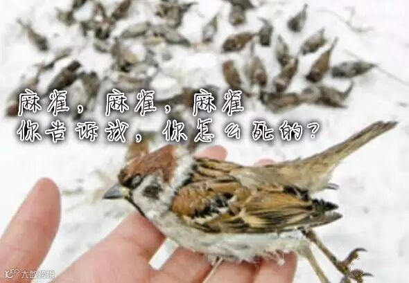 7、2014年6月29日,一艘运送大米的货轮停靠在宜昌码头,不少大米散落在了地上,20余只麻雀在此抢食大米后相继死亡。引起了一场麻雀被撑死还是被毒死的争辩。官方表示:发现麻雀胃内有杀虫剂呋喃丹成份。