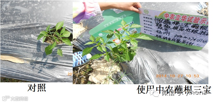 10天回访,根系对比用过中农蘸根三宝的辣椒明显根系发达,新生根多,植株叶色翠绿,新生叶片多