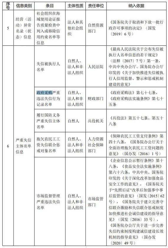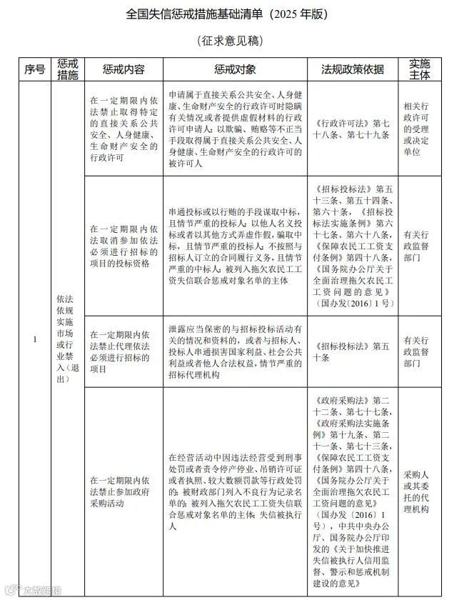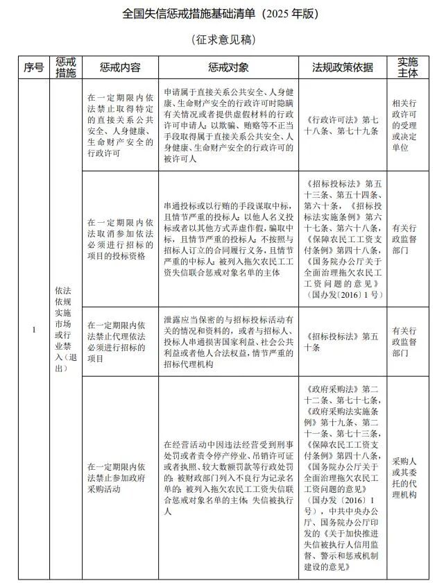 全国公共信用信息基础目录(2025年版)(征求意见稿)中,跟政府采购有关的有:的严重失信主体名单信息方面;全国失信惩戒措施基础清单(2025年版)(征求意见稿)中,跟政府采购相关的有:依法依规实施市场或行业禁入(退出)、依法依规实施职业禁入或从业限制、依法依规纳入严重失信主体名单。