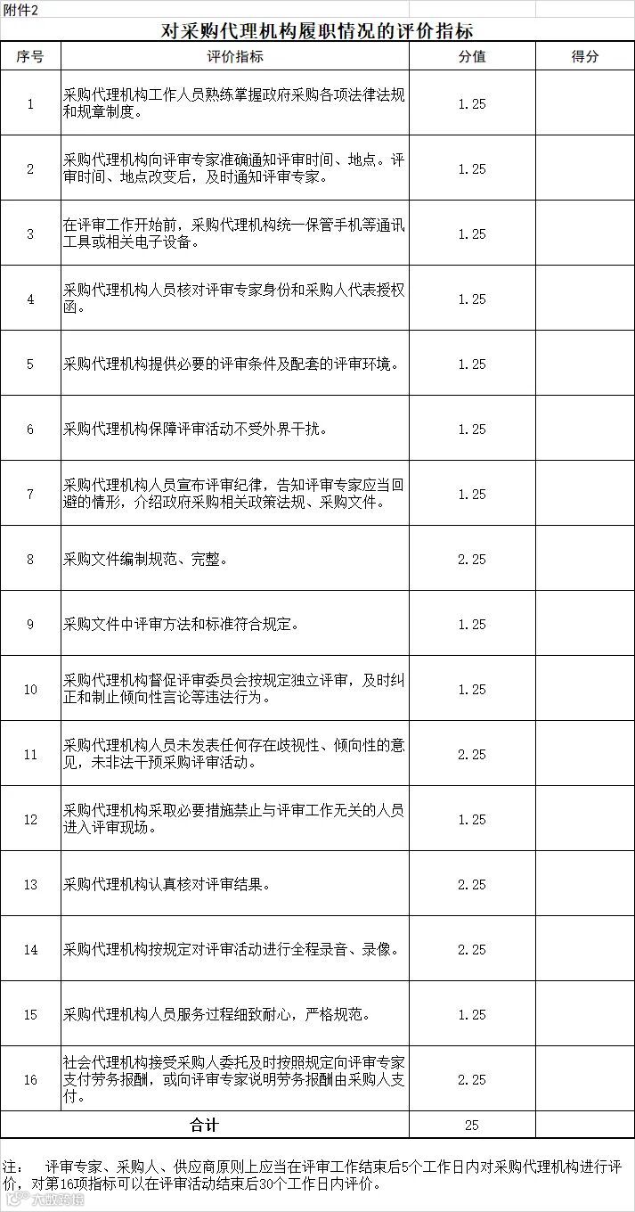 2.日常履职能力评价满分为25分,由评审专家、参与采购活动的供应商和采购人分别独立打分后,按平均数计算得分,一个自然年度内没有代理政府采购项目的采购代理机构得分为0;