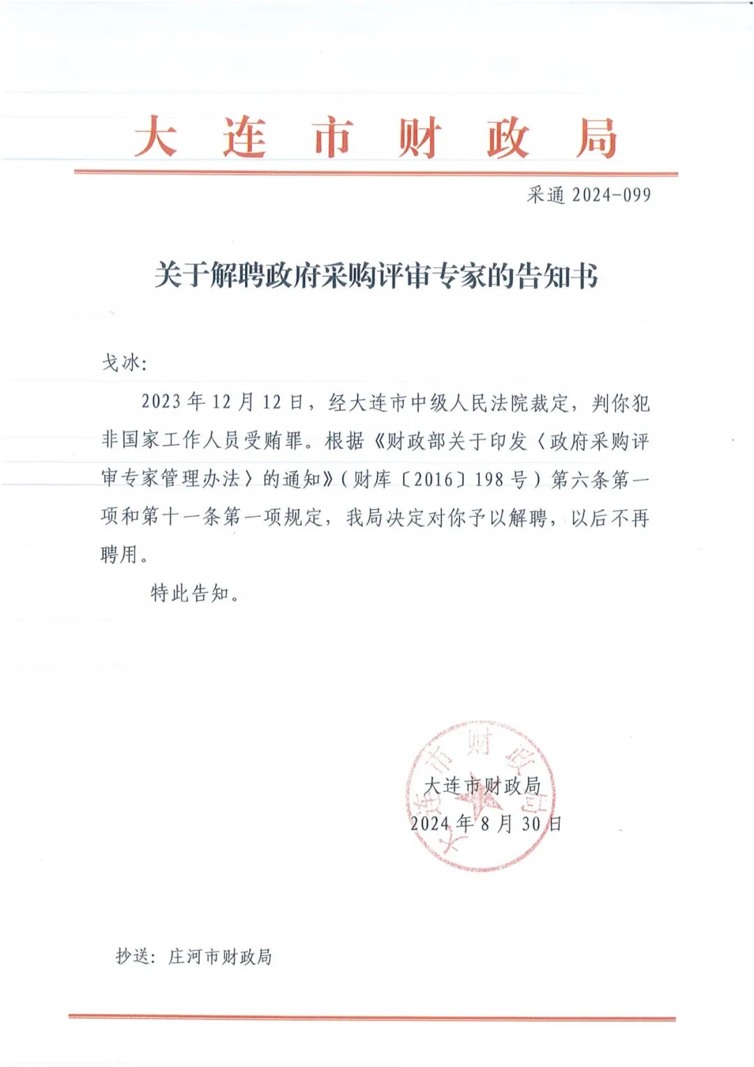 2024年8月30日,大连市财政局发布《关于解聘政府采购评审专家的告知书》,2023年12月12日,经大连市中级人民法院裁定,判戈某犯非国家工作人员受贿罪。根据《财政部关于印发〈政府采购评审专家管理办法〉的通知》(财库〔2016〕198号)第六条第一项和第十一条第一项规定,大连市财政局决定对该专家予以解聘,以后不再聘用。