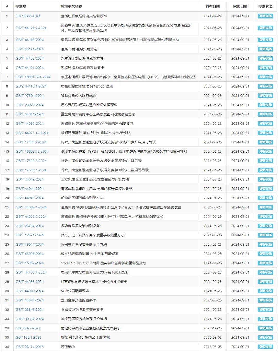 《汽车液压制动系统试验方法》(GB/T 44123-2024)、《汽车、挂车及汽车列车质量参数测量方法》(GB/T 12674-2024)、《乘用车行李舱容积的测量方法》(GB/T 19514-2024)、《电动汽车充换电服务信息交换 第1部分:总则》(GB/T 44130.1-2024)、《登山健身步道配置要求》(GB/T 44090-2024)、《体育公园配置要求》(GB/T 44092-2024)、《物流园区服务规范及评价指标》(GB/T 30334-2024)