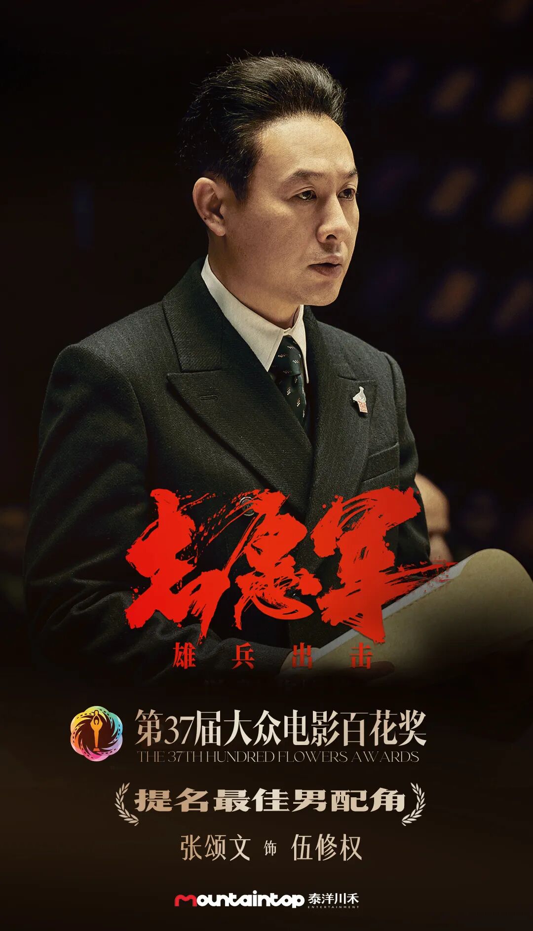 本周二,张颂文凭借《志愿军:雄兵出击》中饰演的“伍修权”一角,获得第37届大众电影百花奖“最佳男配角”提名!