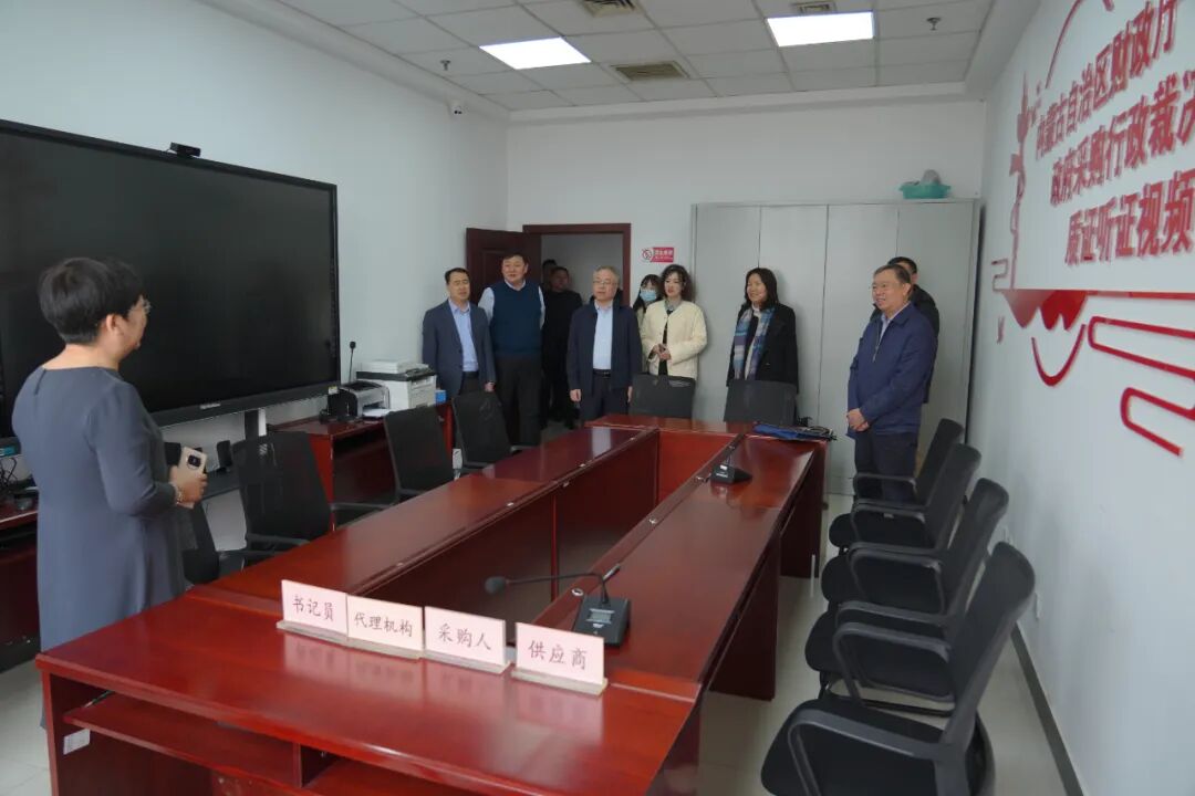 内蒙古自治区财政厅党组成员、副厅长赵大军对王晶一行及刘亚利一行表示热烈欢迎。赵大军、内蒙古自治区财政厅政府采购处处长付晓枫和内蒙古自治区财政厅行政裁决中心四级调研员王学惠带领王晶一行及刘亚利一行参观内蒙古自治区行政裁决远程质证室、询问室和档案管理室。