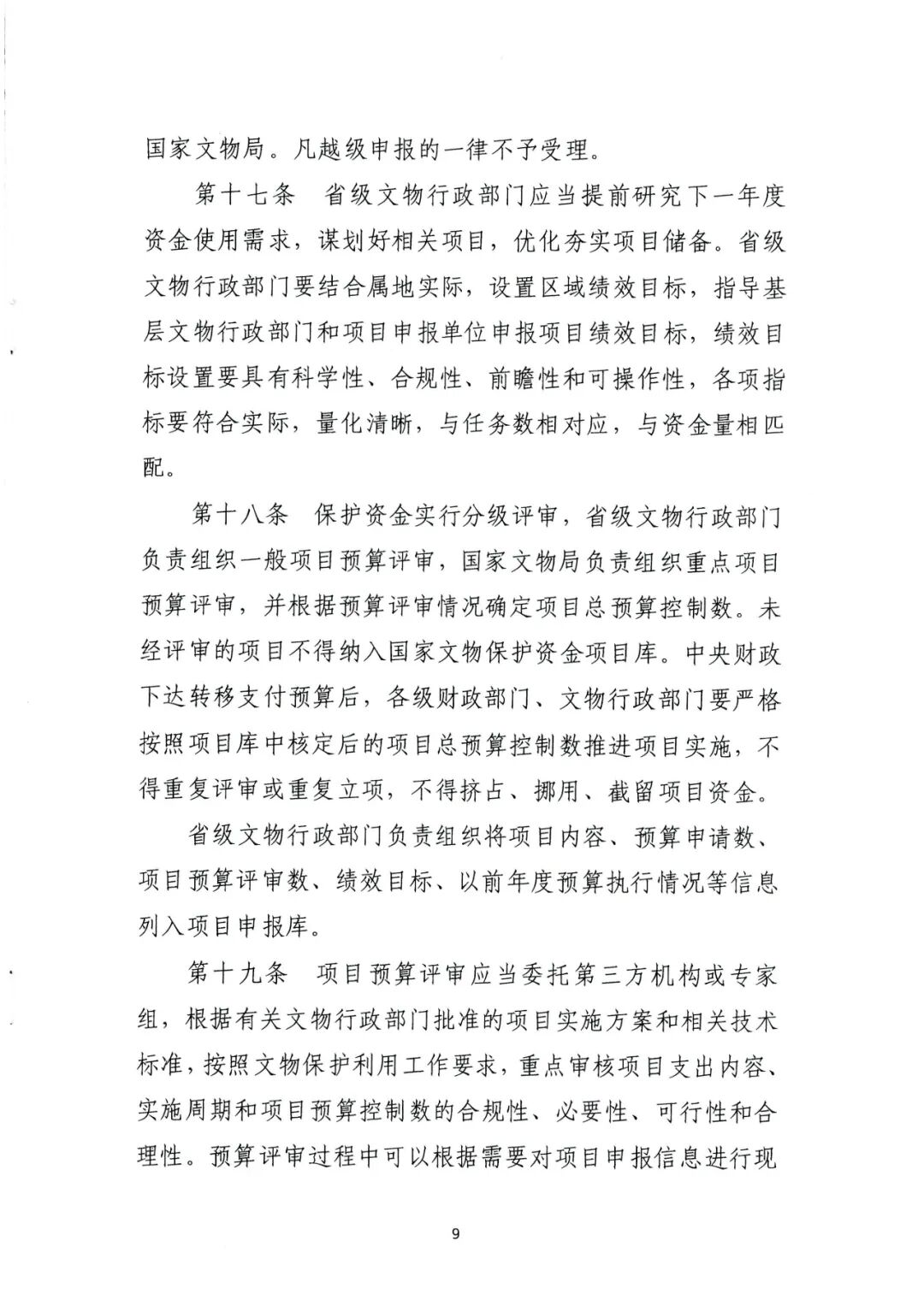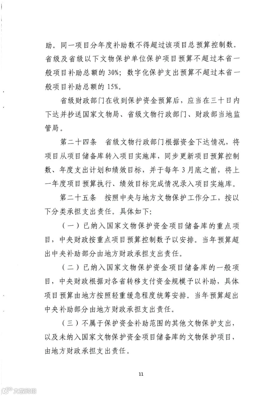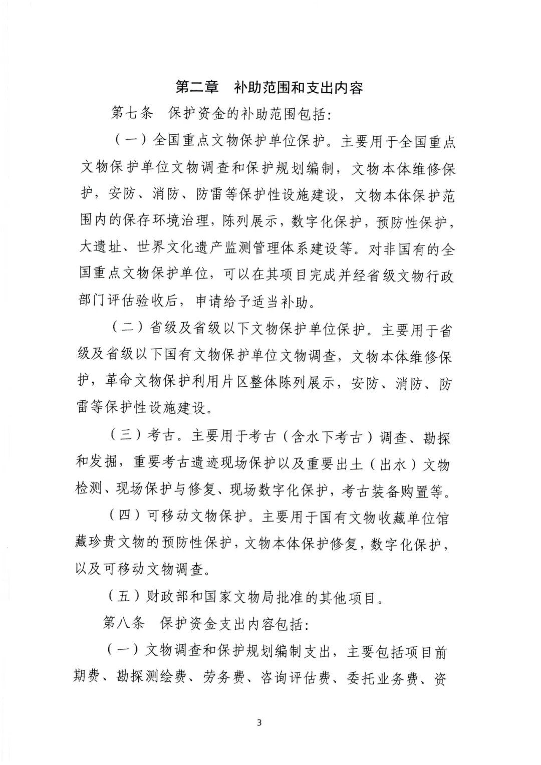 日前,财政部、国家文物局发布《关于印发〈国家文物保护资金管理办法〉的通知》(财教〔2023〕279号,以下简称《办法》)。《办法》包括总则、补助范围和支出内容、分配办法、申报与审批、资金使用管理和监督、附则共6章。