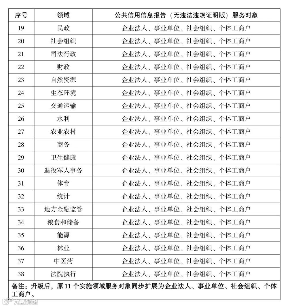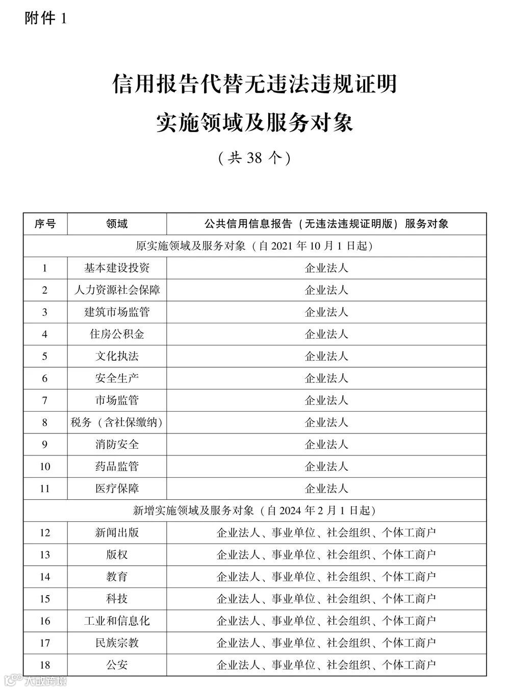《方案》明确,2024年2月1日起在广东省推行以公共信用信息报告(无违法违规证明版)代替38个领域无违法违规证明,进一步便利省内企事业单位、社保组织、个体工商户等信用主体经营活动。2023年12月31日前省直和中直驻粤有关单位完成相关监管信息的核查归集工作,依托省数据资源“一网共享”平台与信用广东平台实时交换共享。2024年1月31日前省发展改革委完成公共信用信息报告(无违法违规证明版)查询模块系统升级,实施信用报告代替相关无违法违规证明。