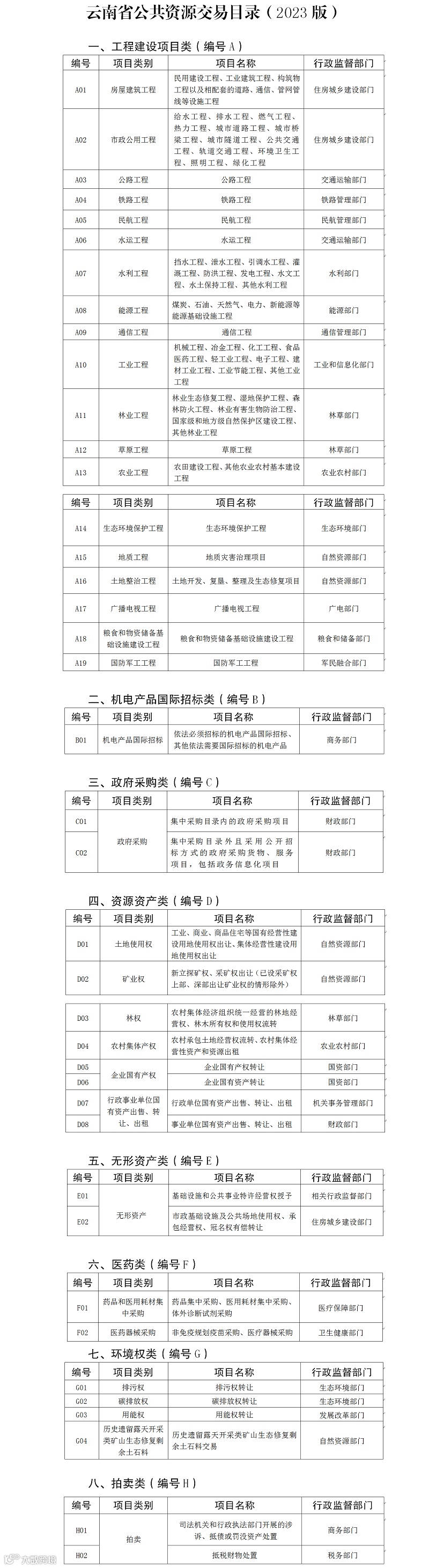 日前,云南省发展和改革委员会对2020年版《云南省公共资源交易目录》进行修订,印发《云南省公共资源交易目录(2023版)》(以下简称2023版目录)。本目录自印发之日起施行,《云南省公共资源交易目录(2020版)》同时废止。