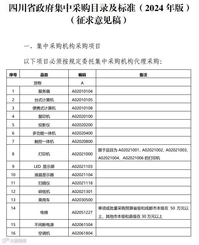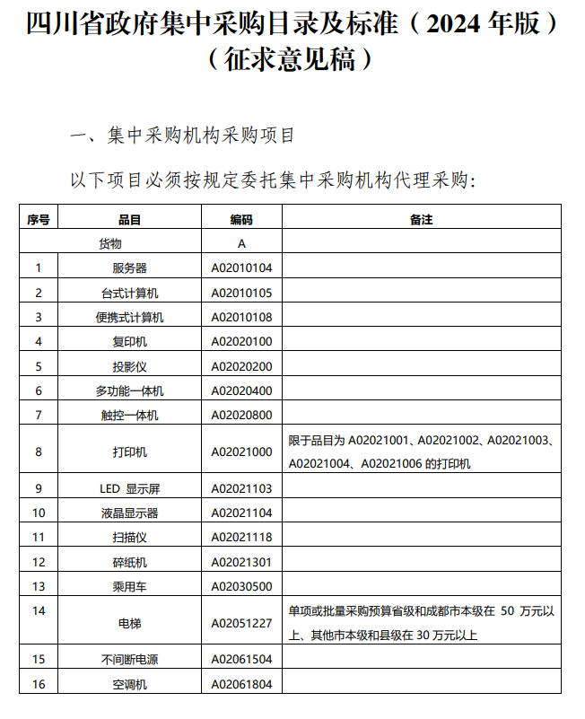 日前,四川省财政厅发布《四川省政府集中采购目录及标准(2024年版)(征求意见稿)》(以下简称《征求意见稿》),征求意见截止时间为2023年9月11日。