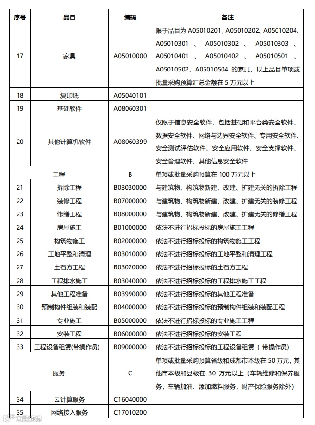 《征求意见稿》指出,必须按照规定委托集中采购机构代理机构的项目可分为货物、工程、服务三类。其中,货物类项目20项,如服务器、台式计算机、便携式计算机、复印机、投影仪、多功能一体机、LED显示屏、液晶显示器、扫描仪、基础软件等;服务类项目7项,如云计算服务、网络接入服务、财产保险服务、物业管理服务、印刷服务、车辆维修和保养服务等;工程类项目13项,如拆除工程、装修工程、土石方工程等。