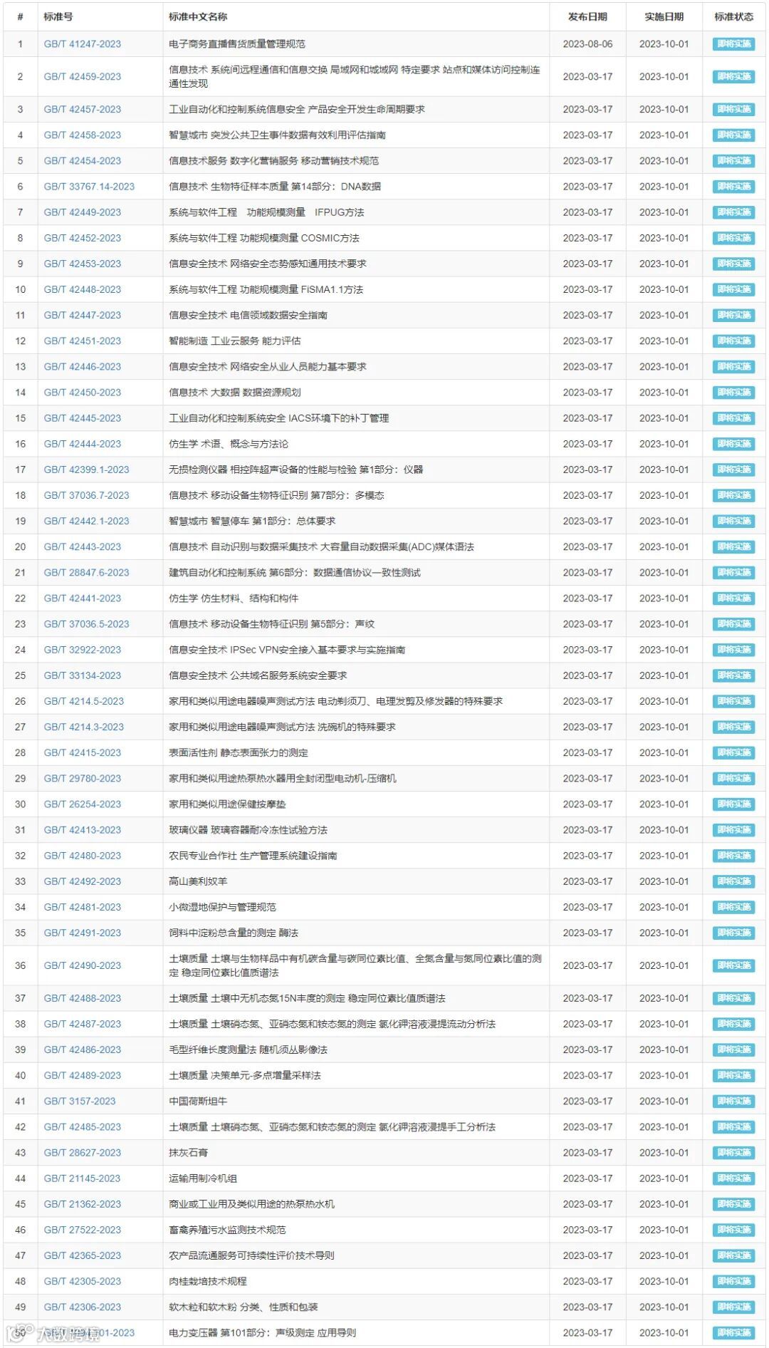 从全国标准信息公共服务平台了解到,2023年10月1日起,共有275项国家标准开始实施。其中包括1项强制性国家标准、270项推荐性国家标准、4项指导性技术文件。