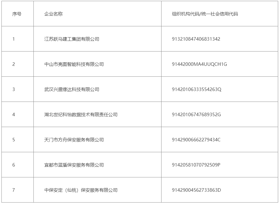 公示表示,2020年以来,部分公路水路工程建设项目招标过程中,发现个别投标人之间存在投标文件制作机器码一致情形,根据相关法律法规和《省交通运输厅关于实施公路水路工程建设市场红黑名单管理的通知》(鄂交建〔2019〕145号)规定,拟将有关单位列入“湖北省公路水路工程建设市场黑名单”,有效期1年。