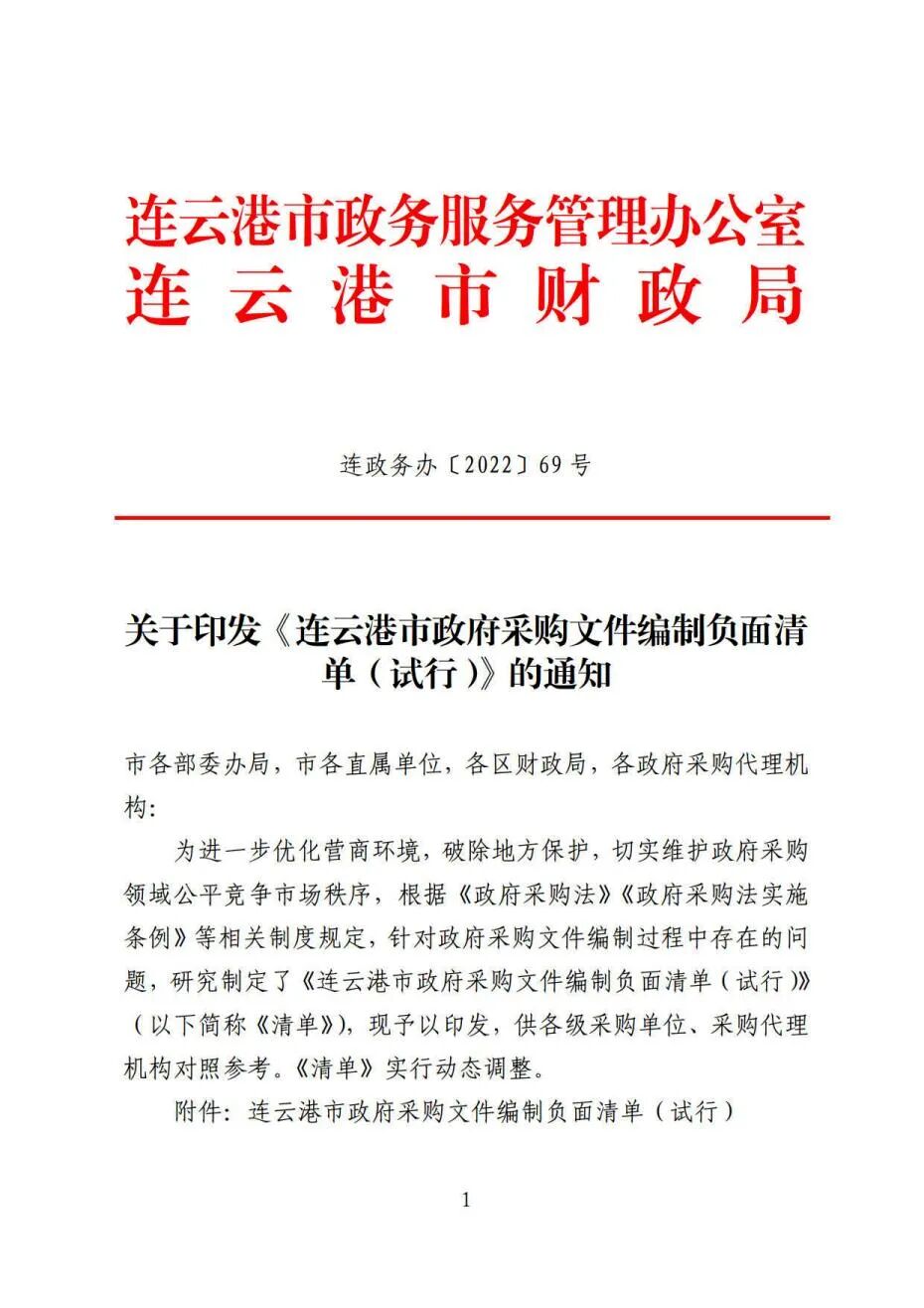 江苏省连云港市针对政府采购文件编制过程中存在的问题,出台《连云港市政府采购文件编制负面清单(试行)》(以下简称《试行清单》),进一步规范政府采购各方当事人行为,保护当事人合法权益。