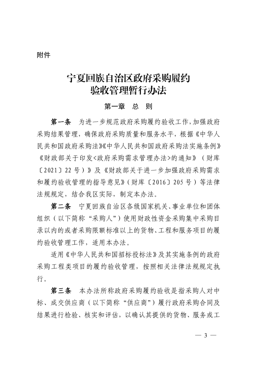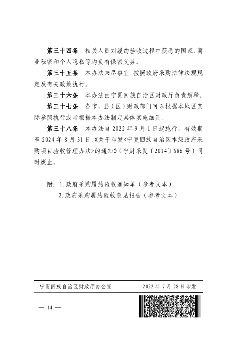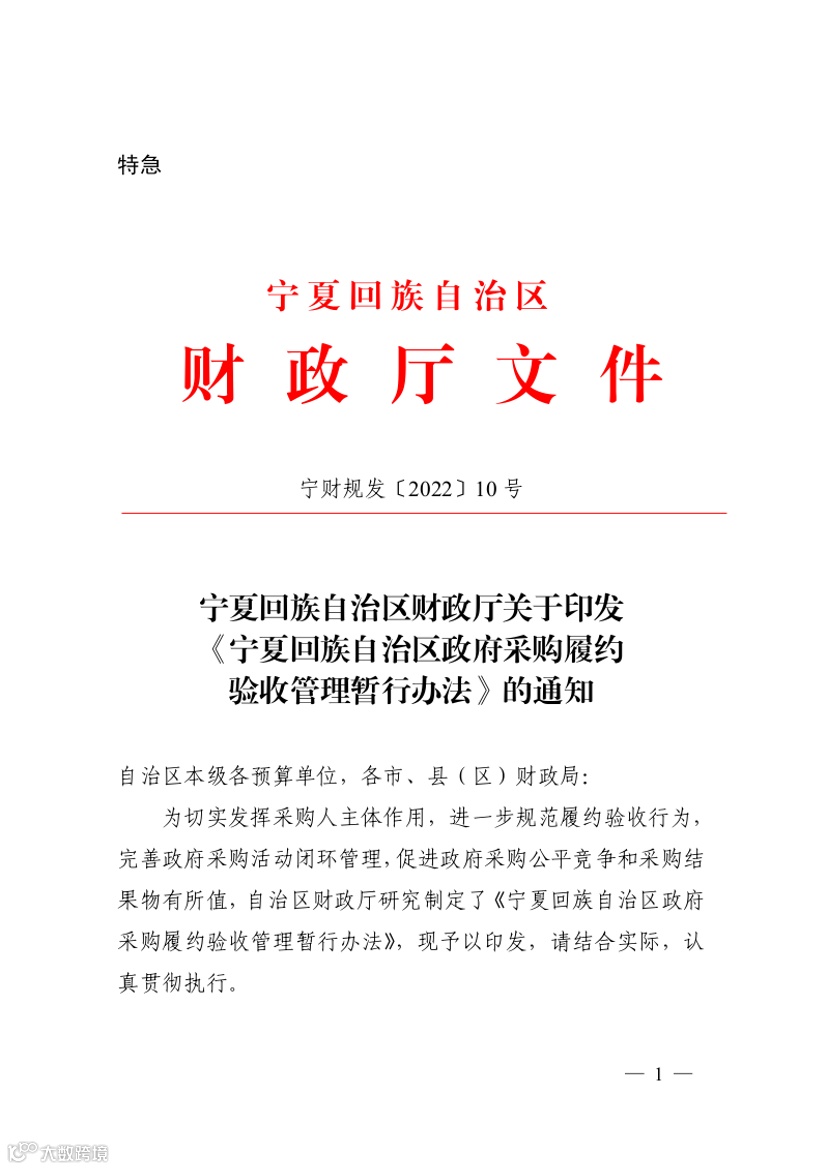 宁夏回族自治区财政厅日前印发了《关于印发<宁夏回族自治区政府采购履约验收管理暂行办法>的通知》(宁财规发〔2022〕10号,以下简称《通知》)。指出,宁夏财政厅研究制定了《宁夏回族自治区政府采购履约验收管理暂行办法》(以下简称《办法》),《办法》自2022年9月1日起施行,有效期至2024年8月31日。《关于印发<宁夏回族自治区本级政府采购项目验收管理办法>的通知》(宁财采发〔2014〕686号)同时废止。