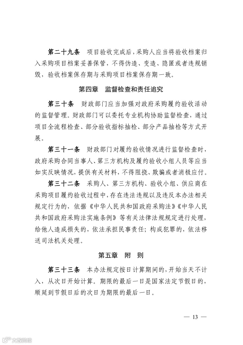 《办法》强调,财政部门应当加强对政府采购履约验收活动的监督管理。财政部门可以委托专业机构协助监督检查,通过项目全流程检查、部分验收指标抽检、部分产品抽检等方式开展。