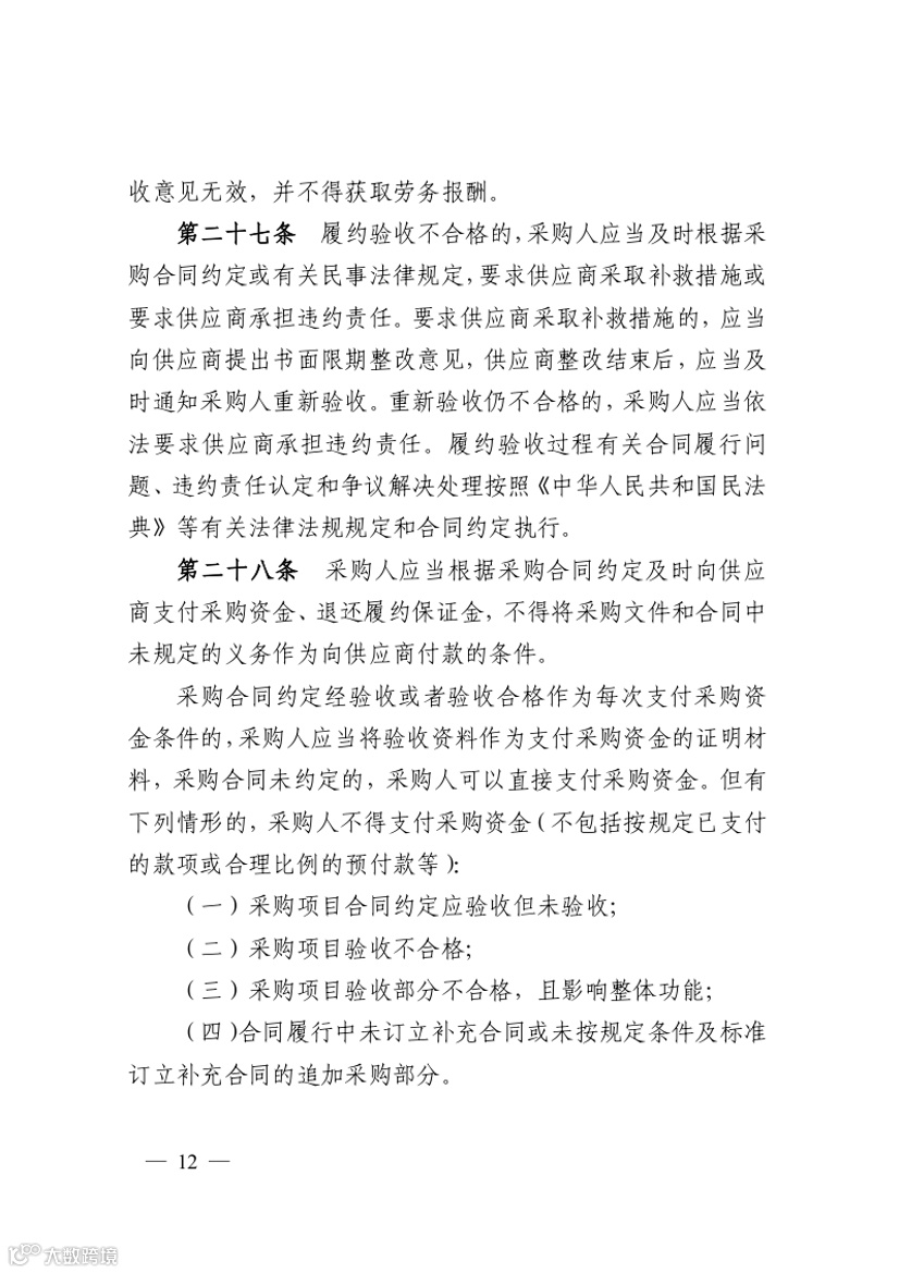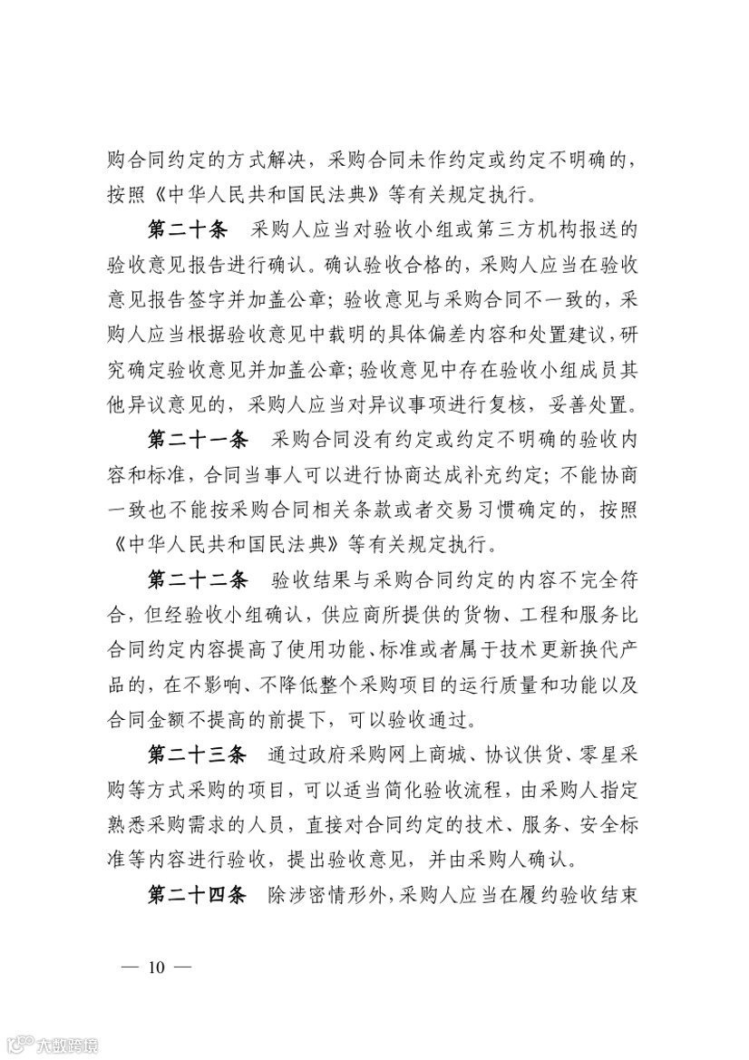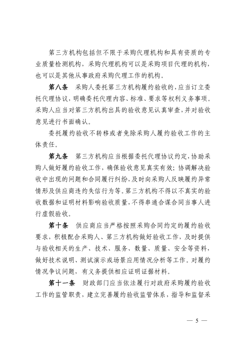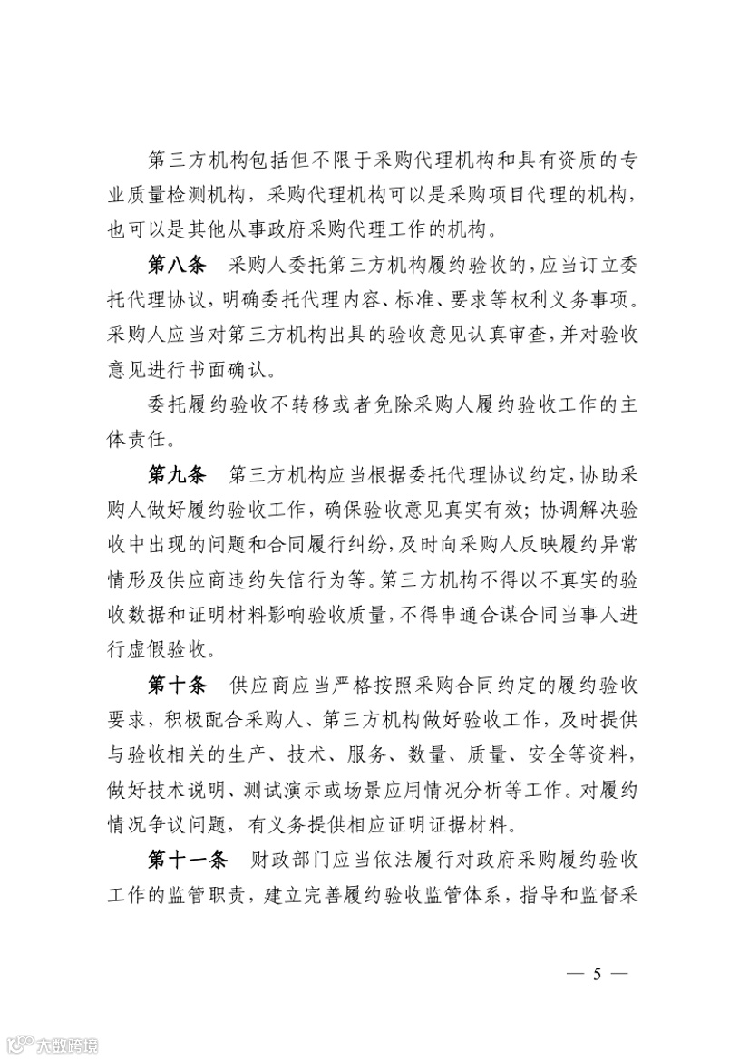 据统计,《办法》共分为总则、履约验收主体及职责、履约验收程序、监督检查和责任追究、附则等五章,具体细化三十八条。并以附件的形式发布了《政府采购履约验收通知单》《政府采购履约验收意见报告》。
