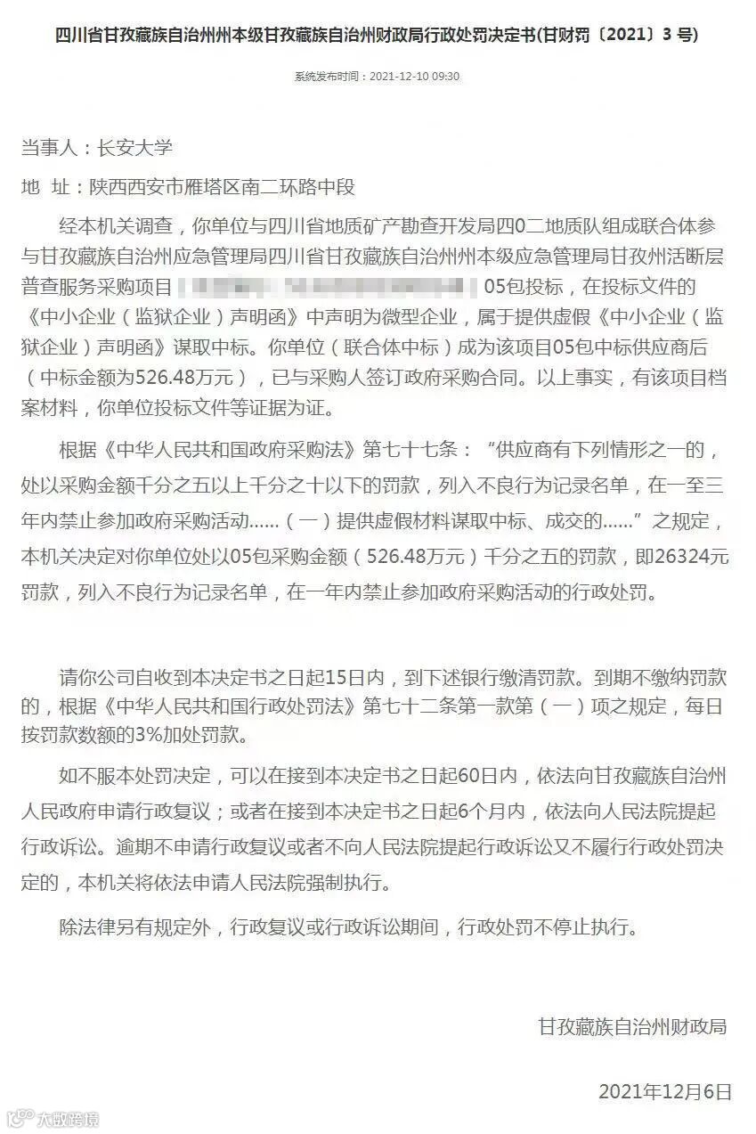 2021年12月6日,甘孜藏族自治州财政局做出行政处罚决定书(甘财罚〔2021〕3 号),称:经本机关调查,你单位与四川省地质矿产勘查开发局四0二地质队组成联合体参与甘孜藏族自治州应急管理局四川省甘孜藏族自治州州本级应急管理局甘孜州活断层普查服务采购项目05包投标,在投标文件的《中小企业(监狱企业)声明函》中声明为微型企业,属于提供虚假《中小企业(监狱企业)声明函》谋取中标。你单位(联合体中标)成为该项目05包中标供应商后(中标金额为526.48万元),已与采购人签订政府采购合同。以上事实,有该项目档案材料,你单位投标文件等证据为证。