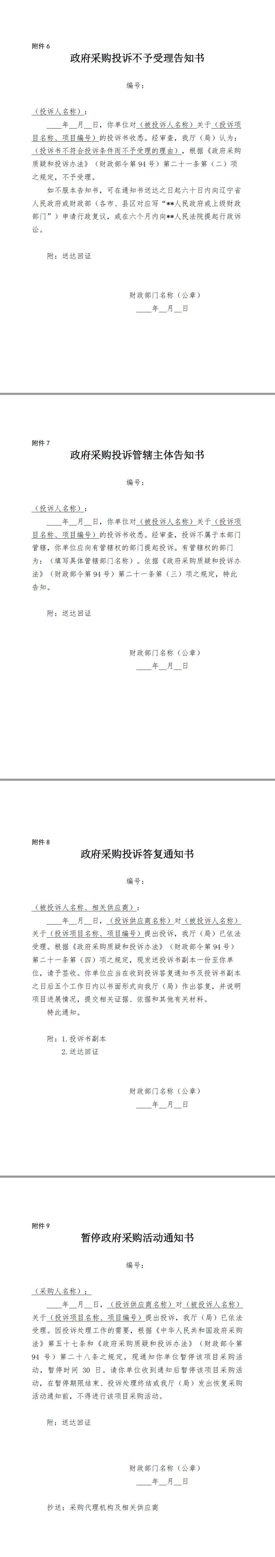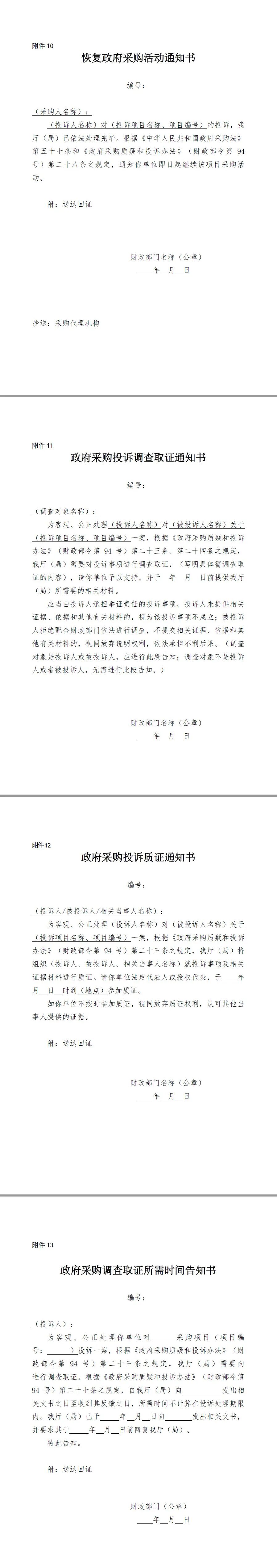 四是提供多类文书模板给各采购当事人和财政监管部门参考。《办法》附二十个政府采购质疑投诉处理文书模板,方便各政府采购当事人了解行政裁决处理各环节要件,使财政监管部门办理政府采购质疑投诉更加合法、规范和高效。
