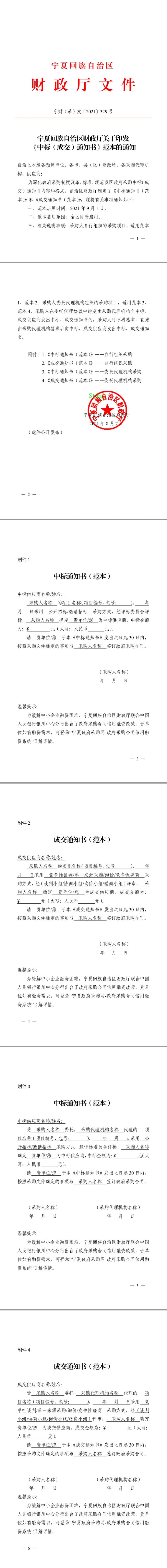 宁夏回族自治区财政厅日前印发了《关于印发<中标(成交)通知书>范本的通知》(宁财(采)发〔2021〕329号,以下简称《通知》)。《通知》指出,为深化政府采购制度改革,标准、规范我区政府采购中标(成交)通知书内容和格式,自治区财政厅制定了《中标通知书(范本)》和《成交通知书(范本)》。