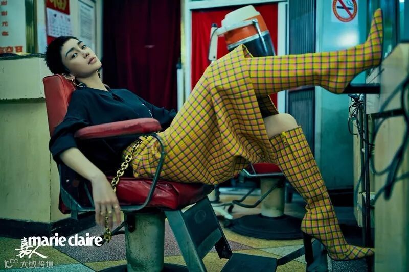 在不足十平米的理发店中,baby穿着黄色格纹半裙与及膝靴,仰坐在旧皮质红沙发上,散发出摩登女郎的独特魅力。