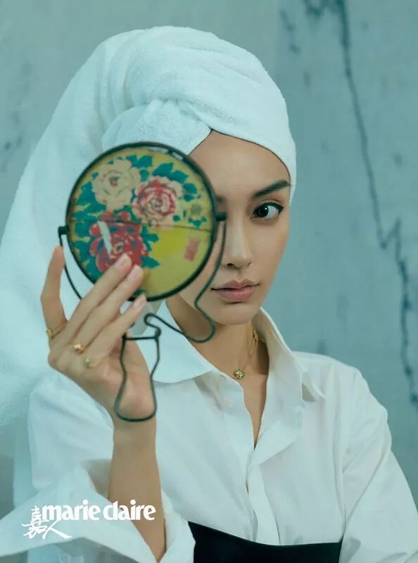 大理石斑纹浴室中弥漫着不用言说的肆意气息,硬朗的眉毛与眼线展现着baby的造型可塑性,眼神里是一份女生少见的棱角。
