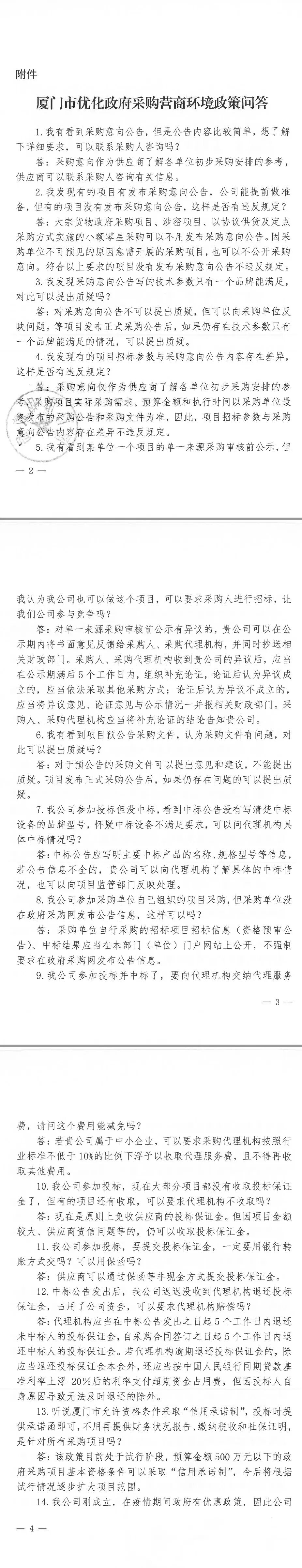 《政府采购信息》报记者近日从厦门市财政局了解到,为了更好地服务供应商,让供应商更好地了解优化政府采购营商环境政策、更好地享受政策红利,该局印发了《厦门市优化政府采购营商环境政策问答》(以下简称《问答》),对供应商关注度最高的50个问题进行了解答。