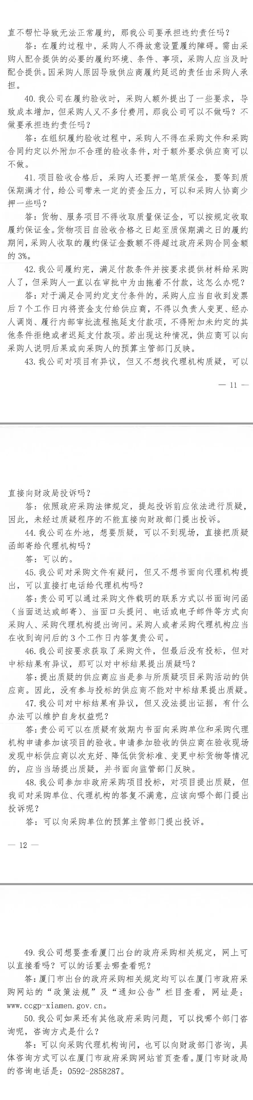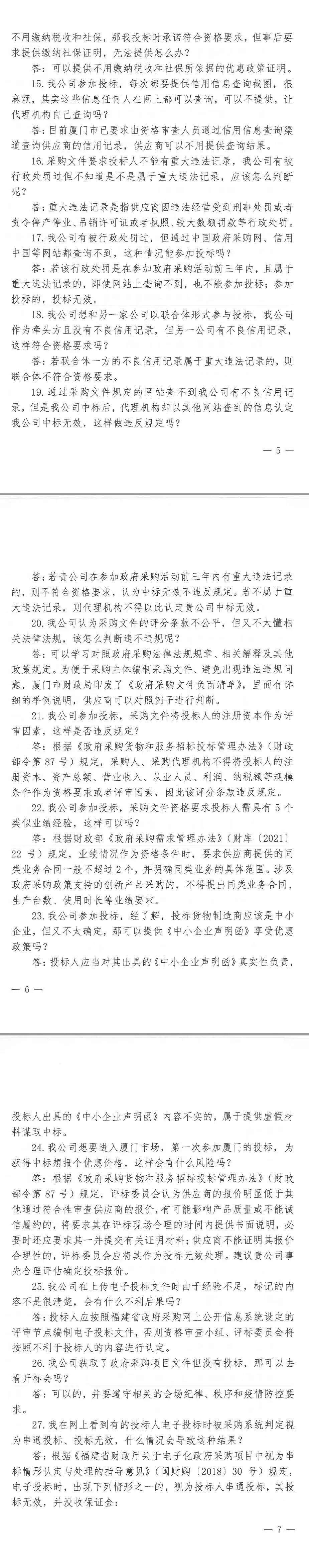 “为了不断减轻供应商参与政府采购的门槛,我市不断推出优化政府采购营商环境的举措,但依然有一些采购单位或代理机构执行不到位,致使不少供应商还是困惑重重。为此,我们认为有必要集中对供应商的疑问进行进一步解答。”厦门市财政局政府采购监管处相关负责人介绍,“比如有很多供应商咨询是否可以就采购意向公告中的参数提出质疑,我们在问答里告诉他们采购意向公开不属于质疑内容,但可以向采购单位反映问题;还有很多供应商问及采购人不配合验收,导致供应商无可奈何,我们明确告诉供应商因采购人原因导致履约延迟的责任由采购人承担……”。
