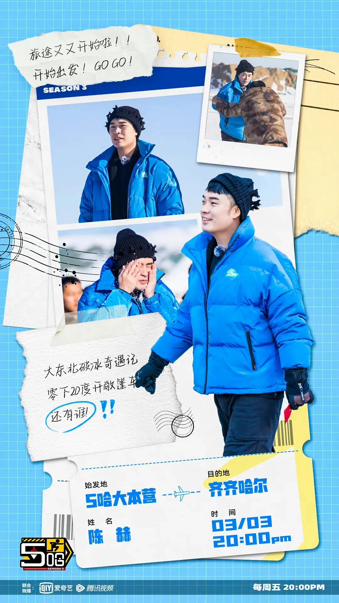 今日,陈赫参与录制的国内首档公路进行式真人秀节目《5哈》第三季第一期即将首播。五哈赫游记豪华跟团游即将出发,第一站带你感受五星级冰雪体验。今晚8点,爱奇艺&腾讯视频播出。